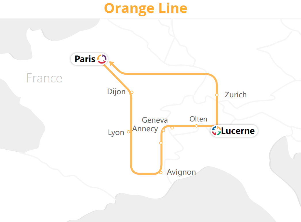 Departure: Paris, Luzern, Venice, Roma, Florence, Milano, Monaco, Lyon